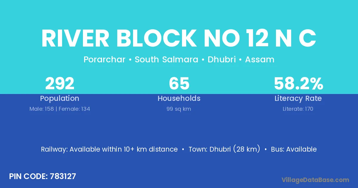 Dhubri (28 km) is the nearest town to River Block No 12 N C village for major economic activities and is located approximately 28 km away.