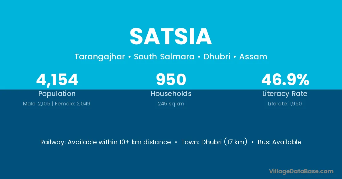 Dhubri (17 km) is the nearest town to Satsia village for major economic activities and is located approximately 17 km away.