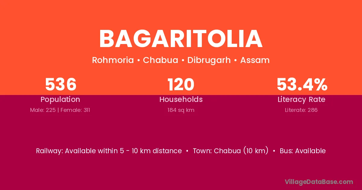 Chabua (10 km) is the nearest town to Bagaritolia village for major economic activities and is located approximately 10 km away.