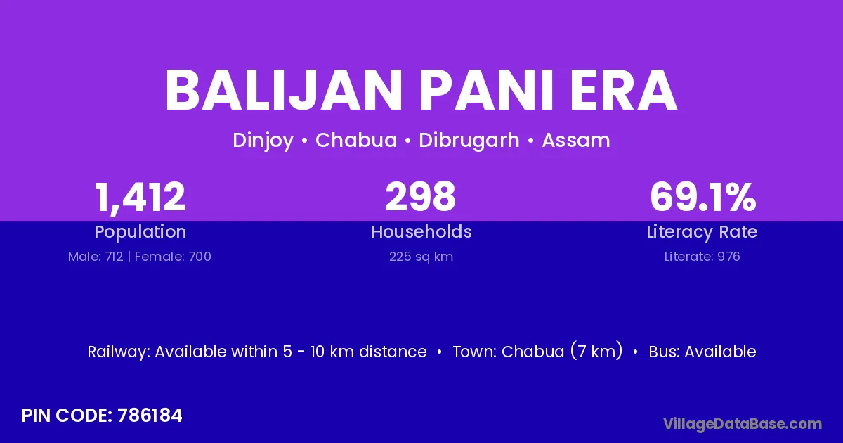 Chabua (7 km) is the nearest town to Balijan Pani Era village for major economic activities and is located approximately 7 km away.
