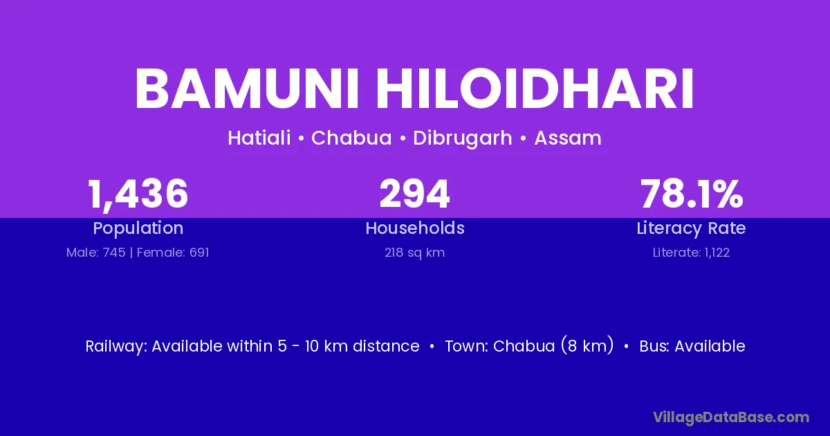 Chabua (8 km) is the nearest town to Bamuni Hiloidhari village for major economic activities and is located approximately 8 km away.