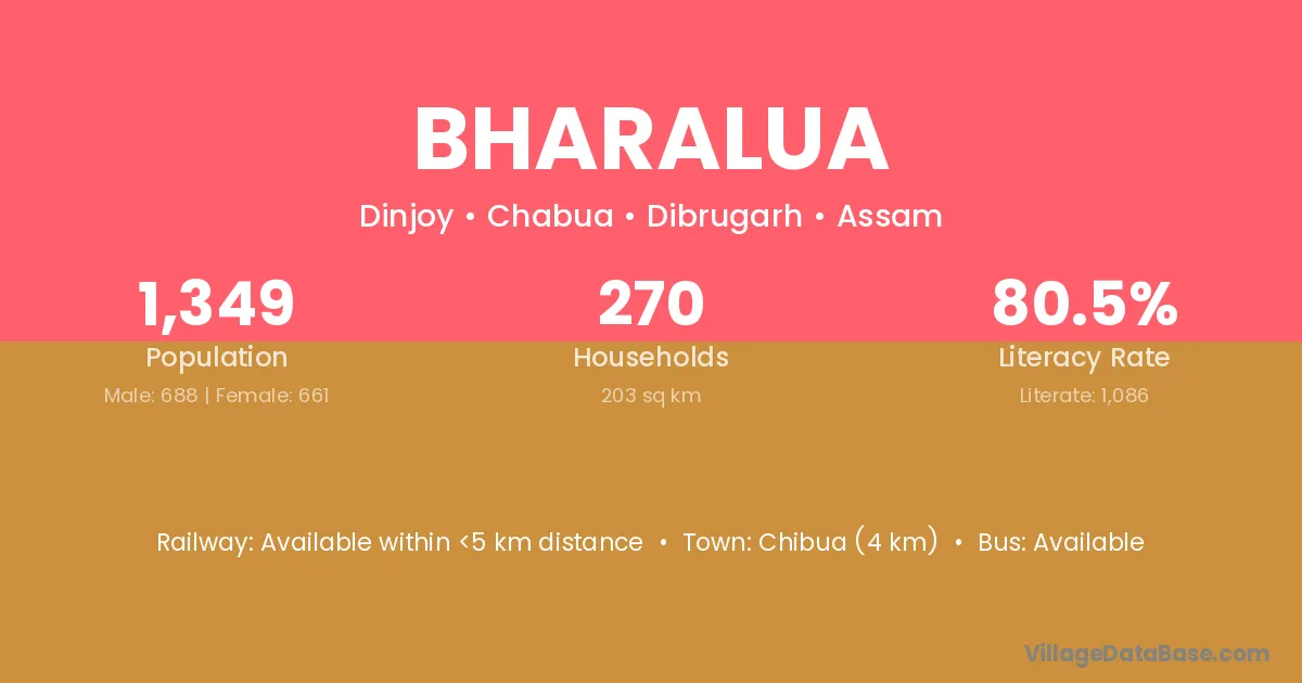 Bharalua village has a total population of 1,349 people, of which 688 are males and 661 are females.