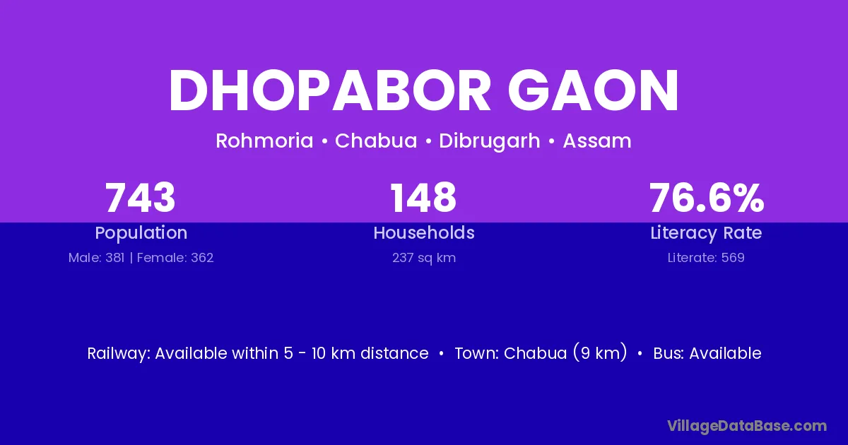 Dhopabor Gaon village has a total population of 743 people, of which 381 are males and 362 are females.
