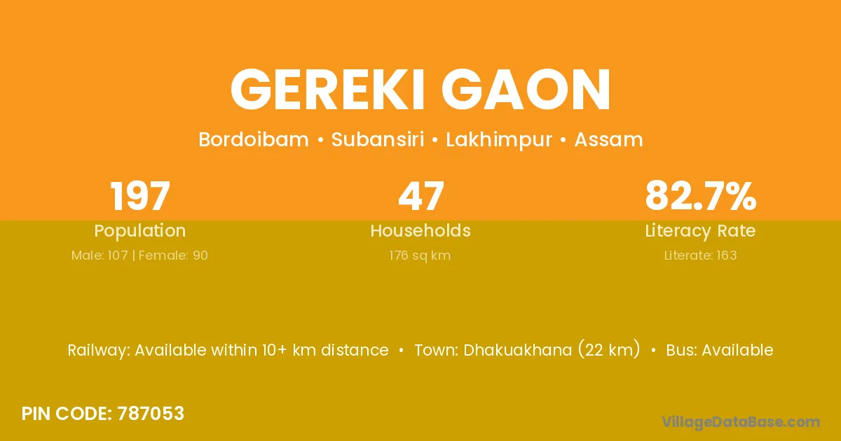 Chabua (11 km) is the nearest town to Gereki Gaon village for major economic activities and is located approximately 11 km away.