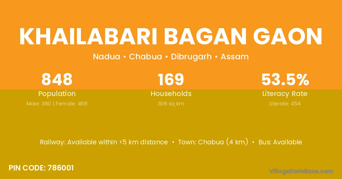 Chabua (4 km) is the nearest town to Khailabari Bagan Gaon village for major economic activities and is located approximately 4 km away.