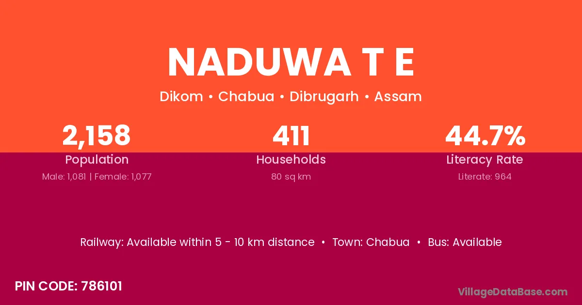 Naduwa T E village has a total population of 2,158 people, of which 1,081 are males and 1,077 are females.