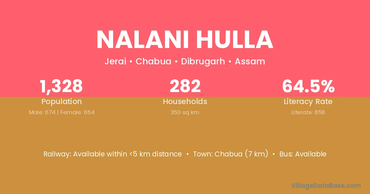 Chabua (7 km) is the nearest town to Nalani Hulla village for major economic activities and is located approximately 7 km away.