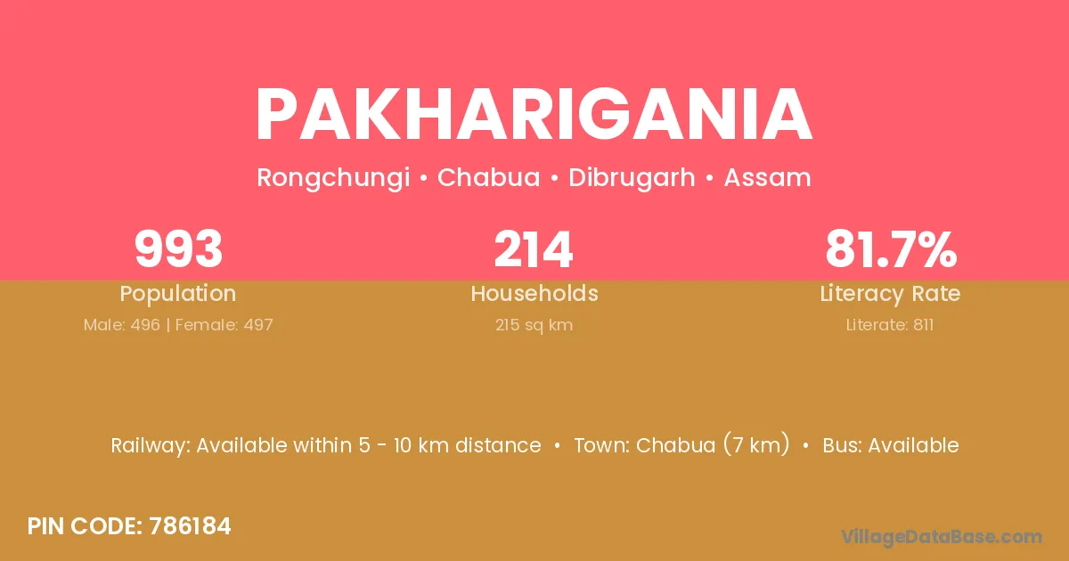 Pakharigania village has a total population of 993 people, of which 496 are males and 497 are females.