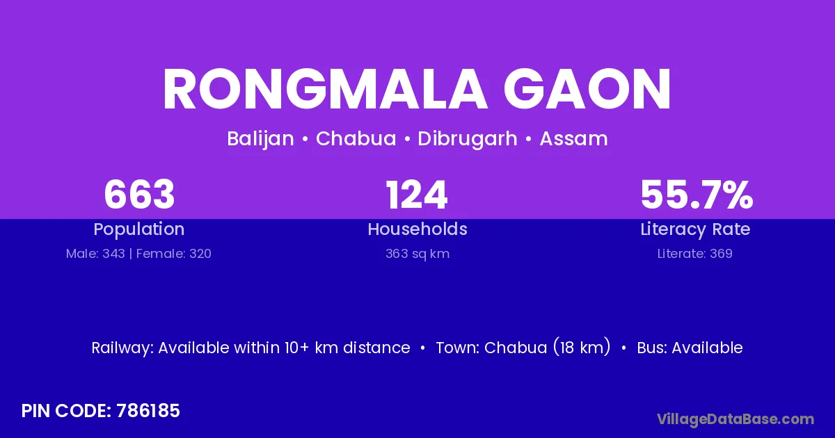 Chabua (18 km) is the nearest town to Rongmala Gaon village for major economic activities and is located approximately 18 km away.