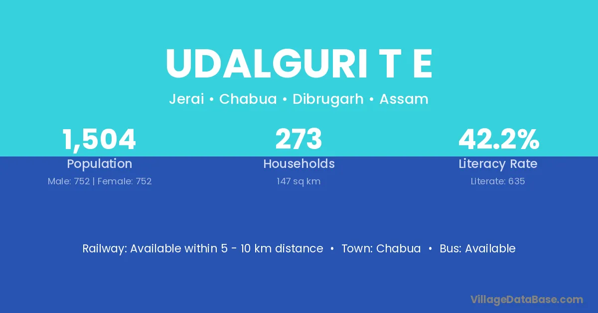 Udalguri T E village has a total population of 1,504 people, of which 752 are males and 752 are females.