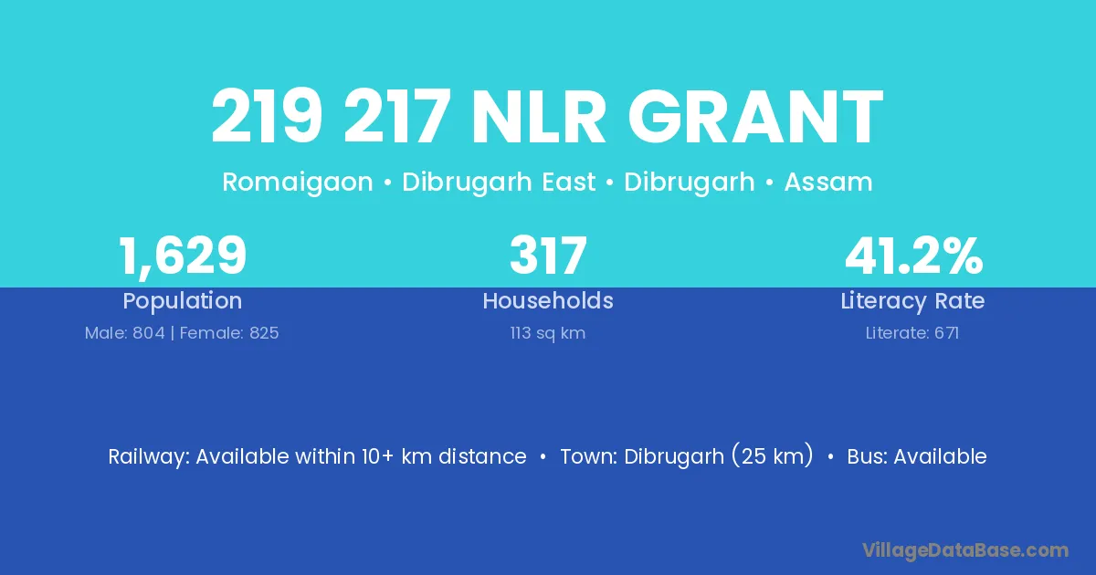 Dibrugarh (25 km) is the nearest town to 219 217 Nlr Grant village for major economic activities and is located approximately 25 km away.