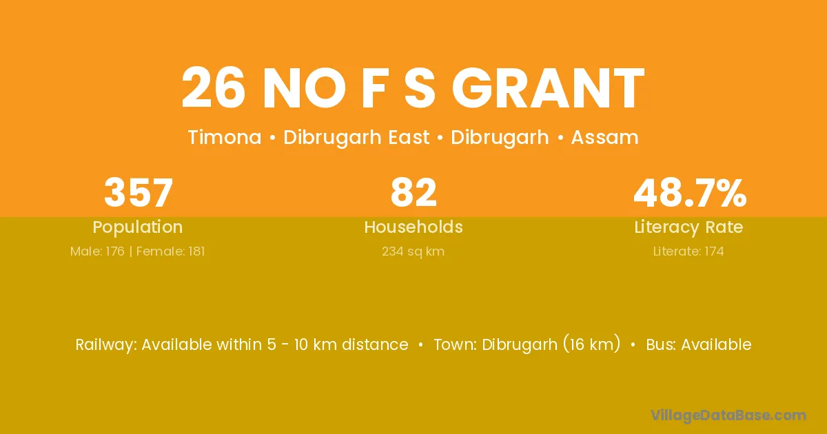 Dibrugarh (16 km) is the nearest town to 26 No F S Grant village for major economic activities and is located approximately 16 km away.