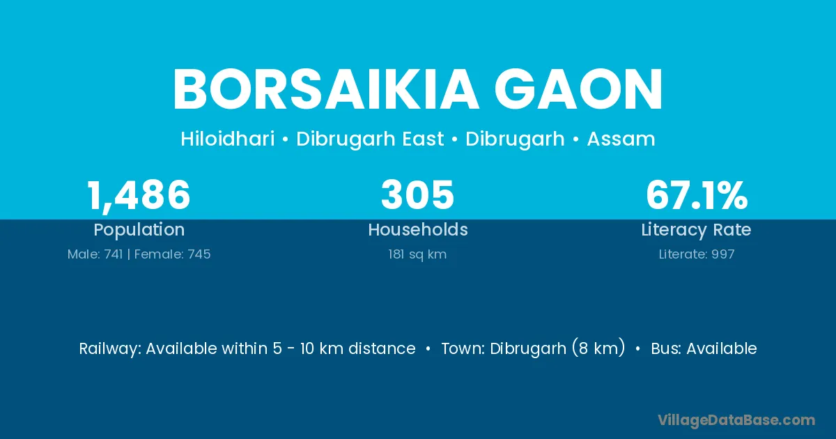 Borsaikia Gaon village has a total population of 1,486 people, of which 741 are males and 745 are females.