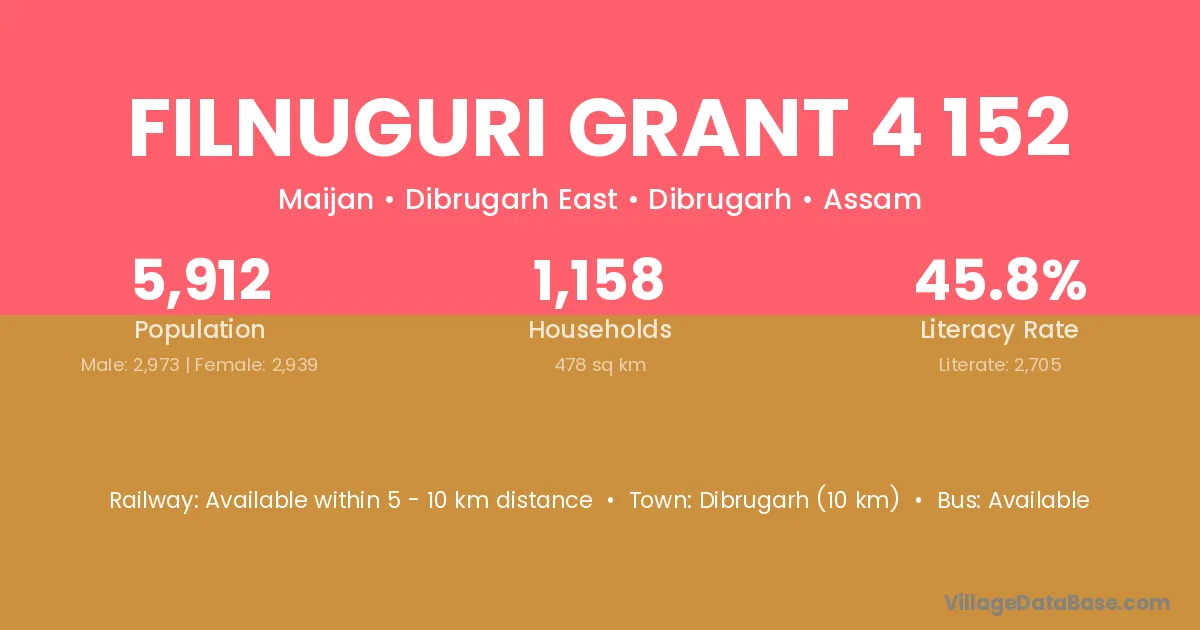 Dibrugarh (10 km) is the nearest town to Filnuguri Grant 4 152 village for major economic activities and is located approximately 10 km away.