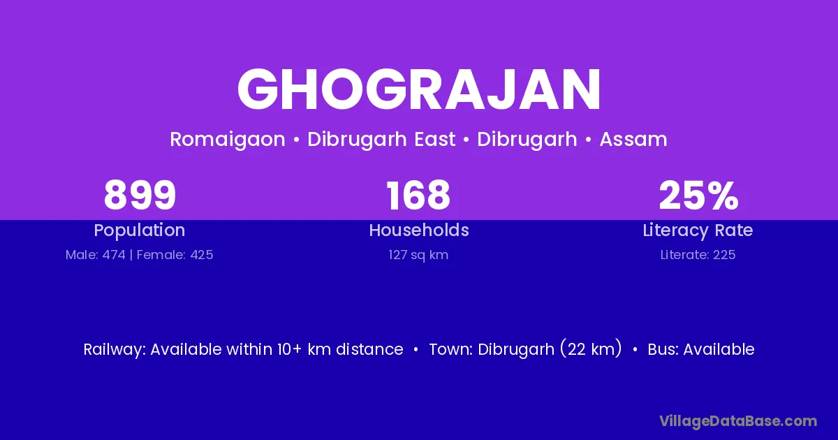 Dibrugarh (22 km) is the nearest town to Ghograjan village for major economic activities and is located approximately 22 km away.