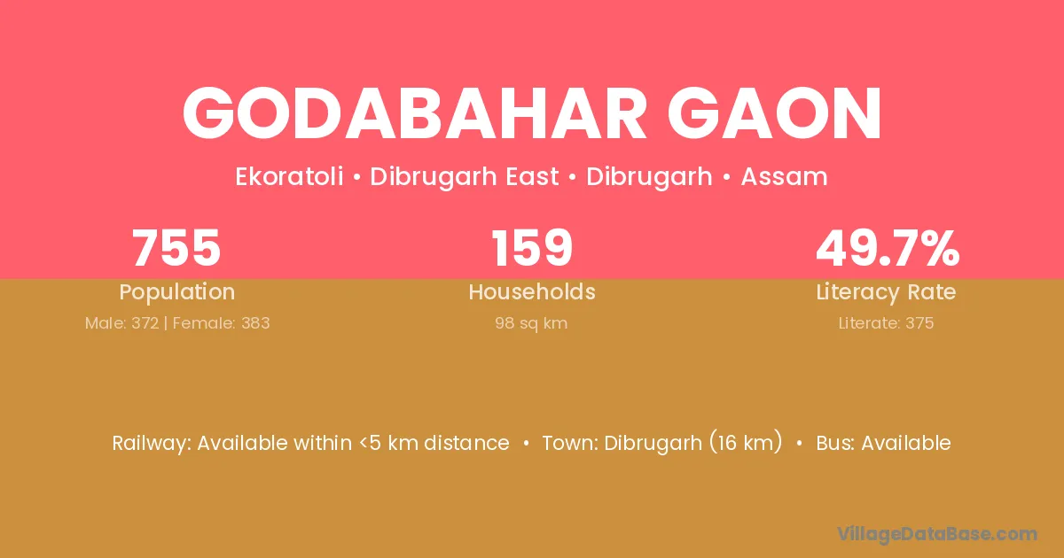 Godabahar Gaon village has a total population of 755 people, of which 372 are males and 383 are females.