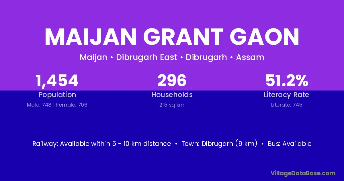 Dibrugarh (9 km) is the nearest town to Maijan Grant Gaon village for major economic activities and is located approximately 9 km away.