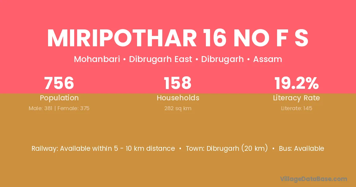 Dibrugarh (20 km) is the nearest town to Miripothar 16 No F S village for major economic activities and is located approximately 20 km away.