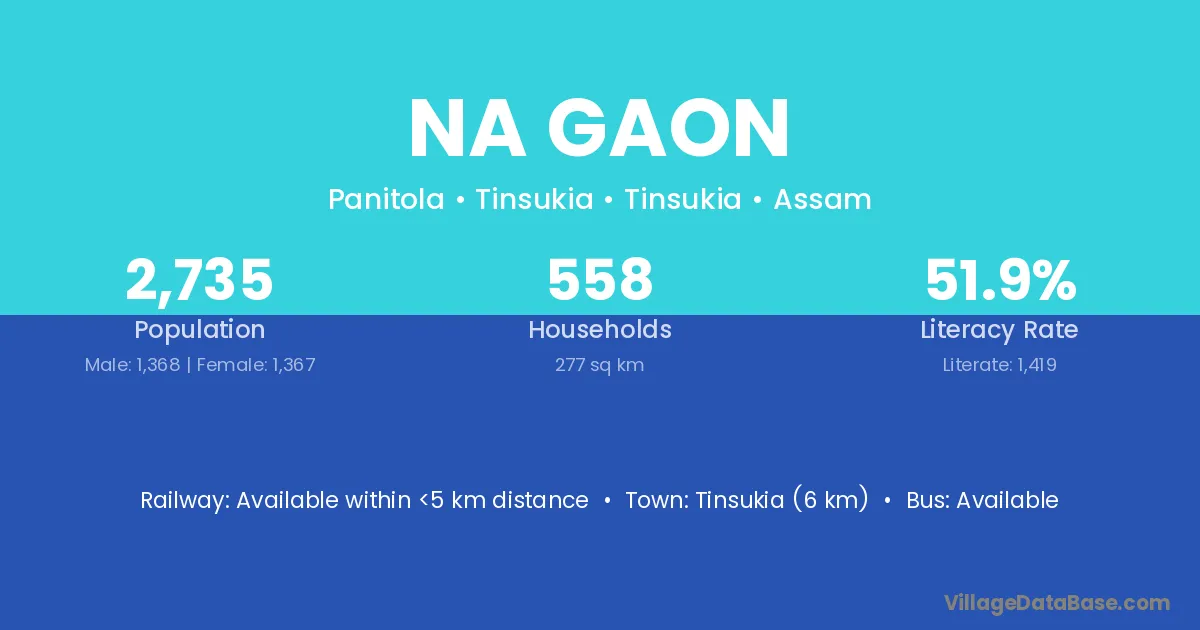 Dibrugarh (16 km) is the nearest town to Na Gaon village for major economic activities and is located approximately 16 km away.