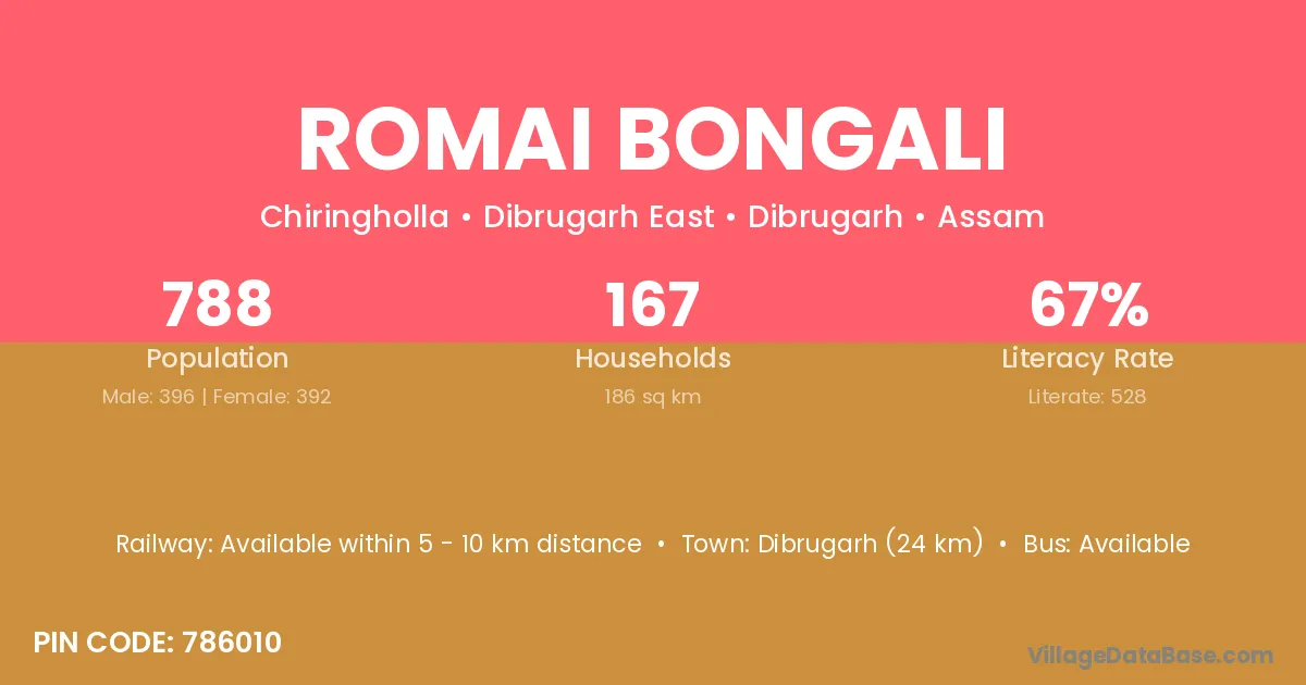 Dibrugarh (24 km) is the nearest town to Romai Bongali village for major economic activities and is located approximately 24 km away.