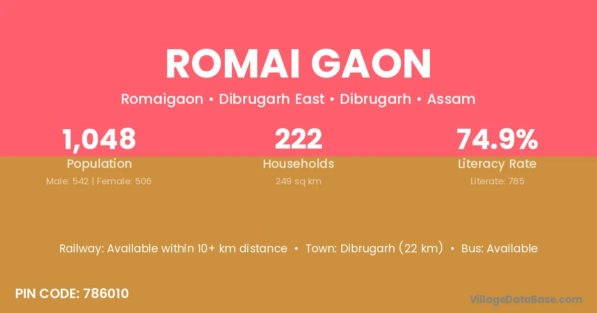 Dibrugarh (22 km) is the nearest town to Romai Gaon village for major economic activities and is located approximately 22 km away.