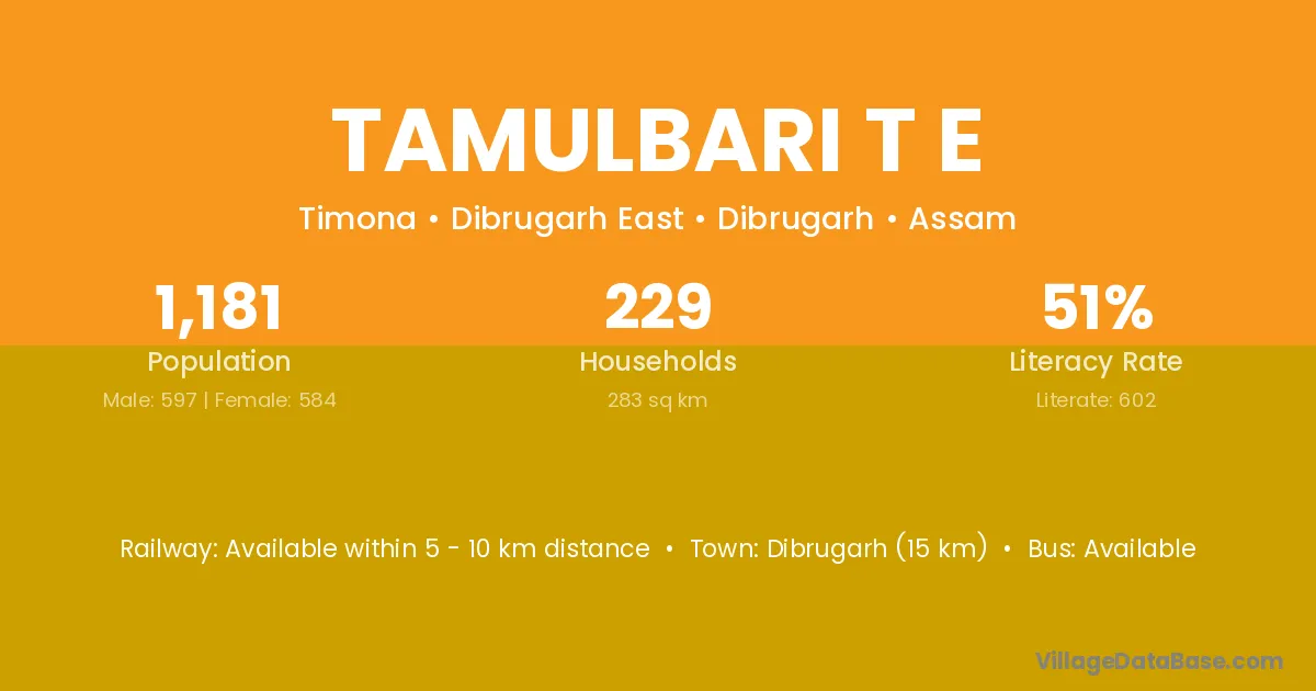 Tamulbari T E village has a total population of 1,181 people, of which 597 are males and 584 are females.
