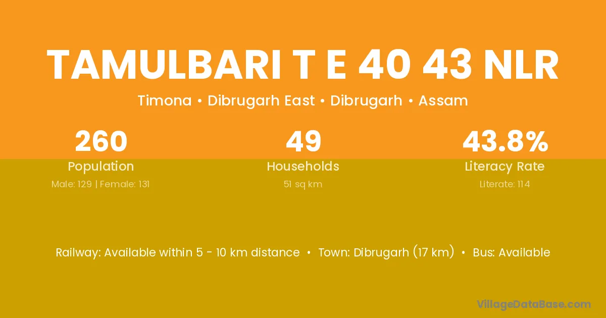 Tamulbari T E 40 43 Nlr village has a total population of 260 people, of which 129 are males and 131 are females.