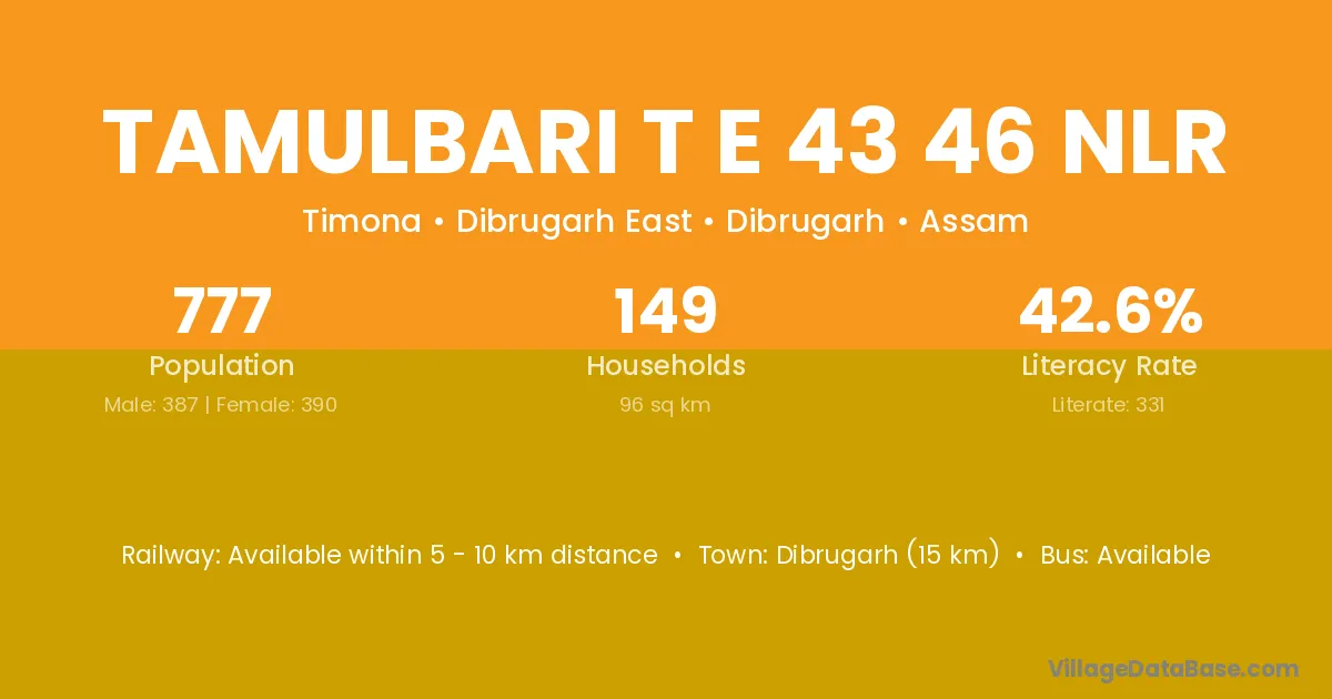 Dibrugarh (15 km) is the nearest town to Tamulbari T E 43 46 Nlr village for major economic activities and is located approximately 15 km away.