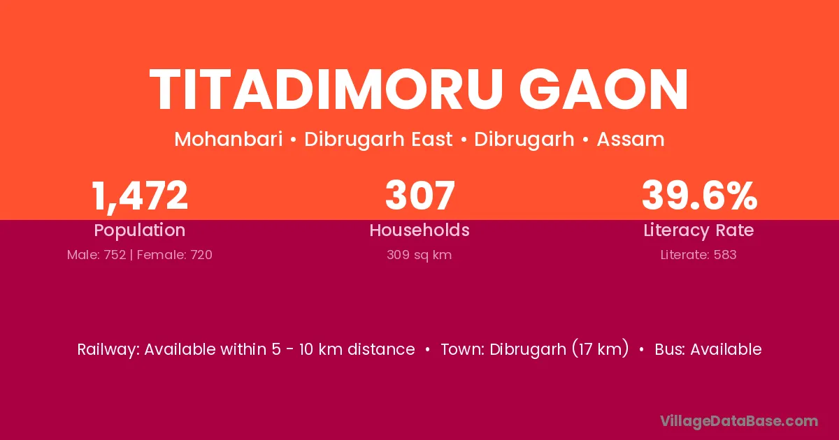 Dibrugarh (17 km) is the nearest town to Titadimoru Gaon village for major economic activities and is located approximately 17 km away.