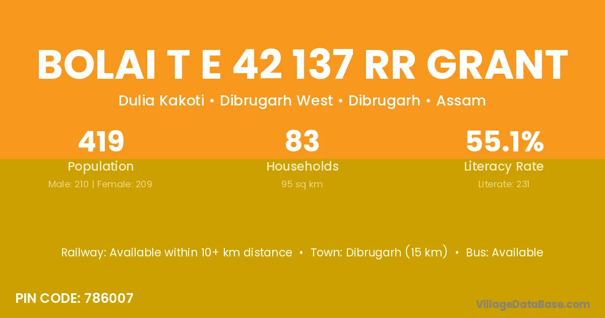 Dibrugarh (15 km) is the nearest town to Bolai T E 42 137 Rr Grant village for major economic activities and is located approximately 15 km away.