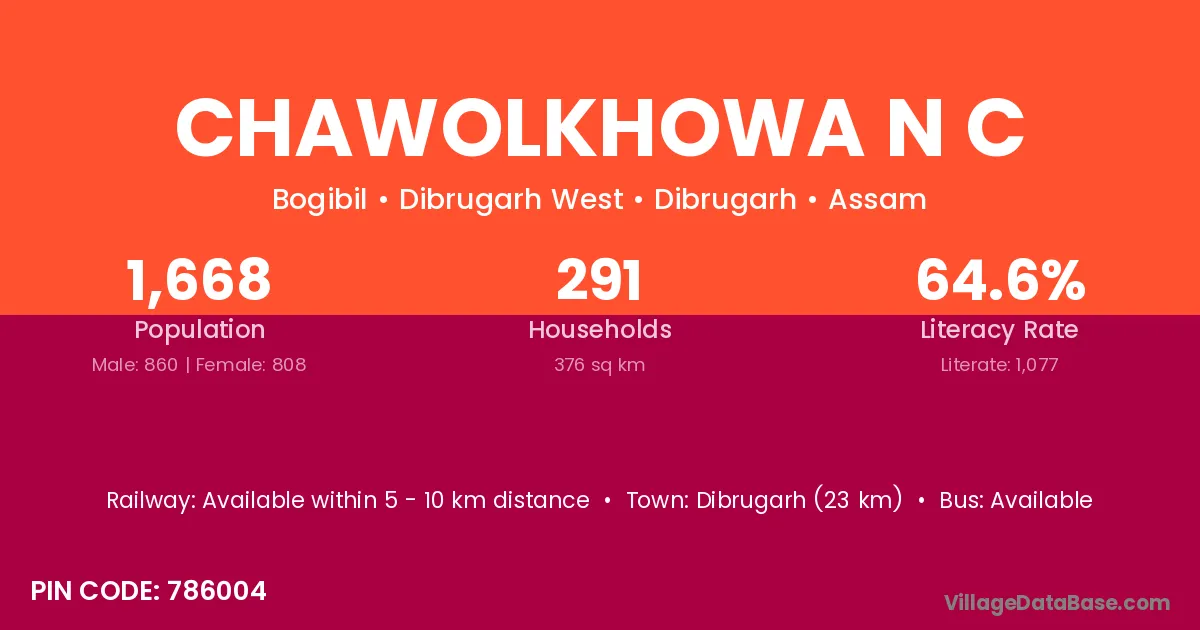 Dibrugarh (23 km) is the nearest town to Chawolkhowa N C village for major economic activities and is located approximately 23 km away.