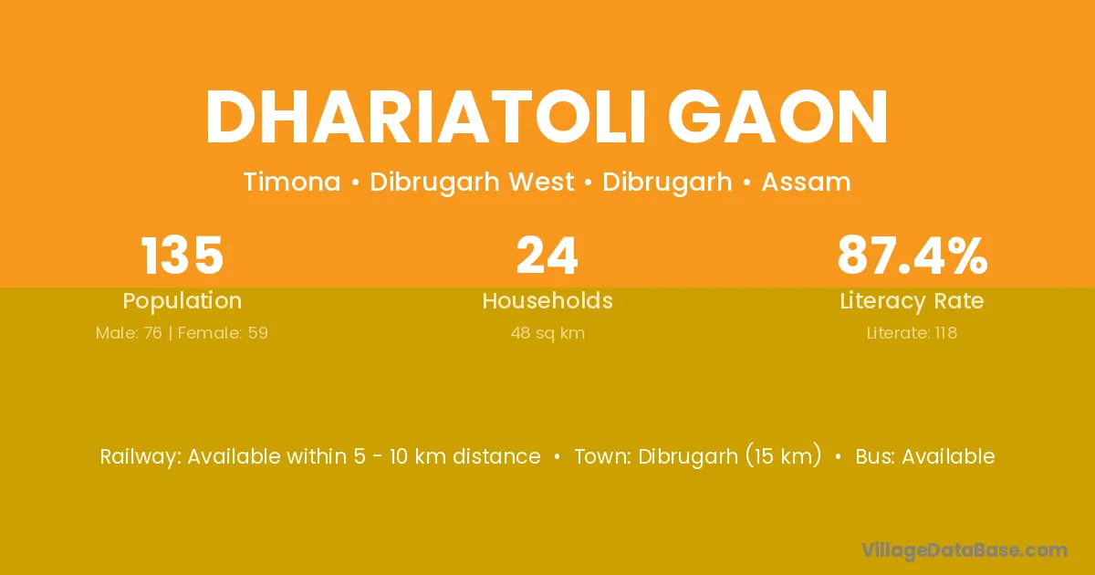 Dibrugarh (15 km) is the nearest town to Dhariatoli Gaon village for major economic activities and is located approximately 15 km away.