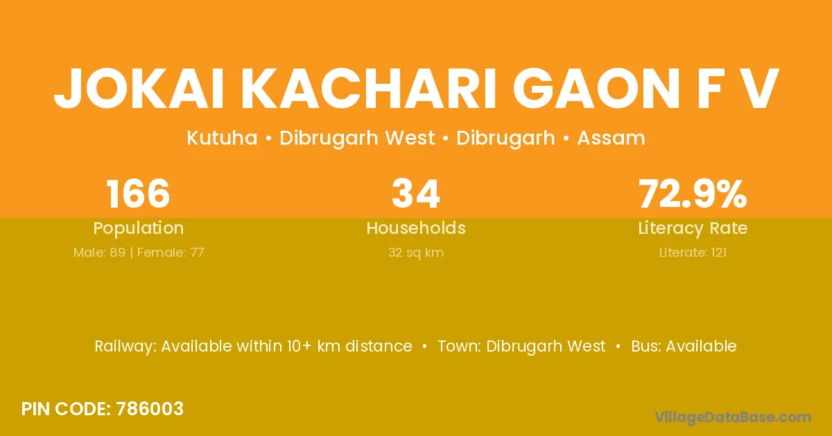 Jokai Kachari Gaon F V village has a total population of 166 people, of which 89 are males and 77 are females.