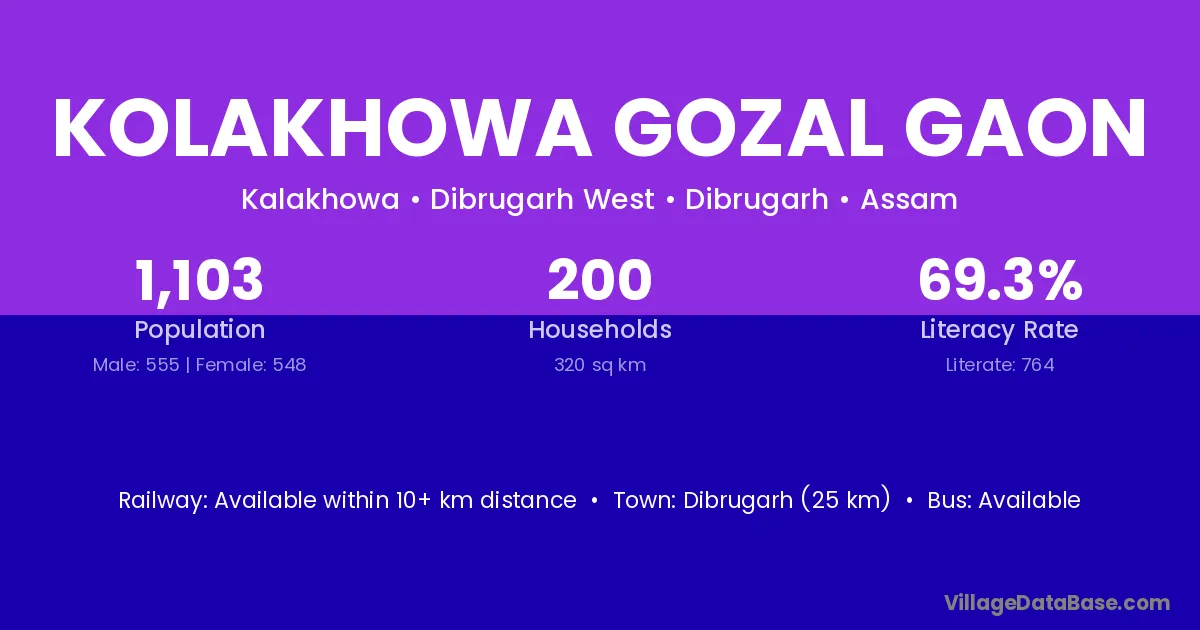Kolakhowa Gozal Gaon village has a total population of 1,103 people, of which 555 are males and 548 are females.