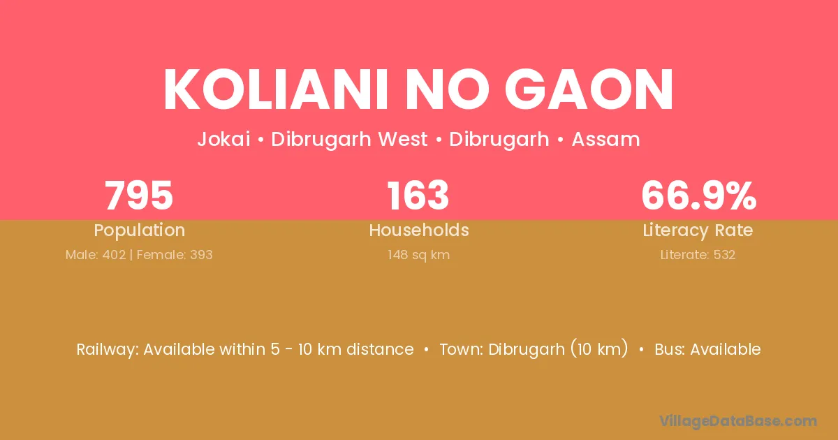 Dibrugarh (10 km) is the nearest town to Koliani No Gaon village for major economic activities and is located approximately 10 km away.