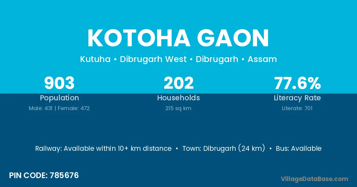 Dibrugarh (24 km) is the nearest town to Kotoha Gaon village for major economic activities and is located approximately 24 km away.