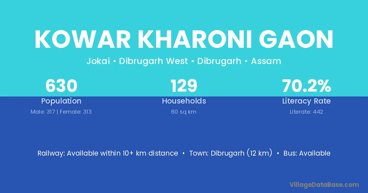 Dibrugarh (12 km) is the nearest town to Kowar Kharoni Gaon village for major economic activities and is located approximately 12 km away.
