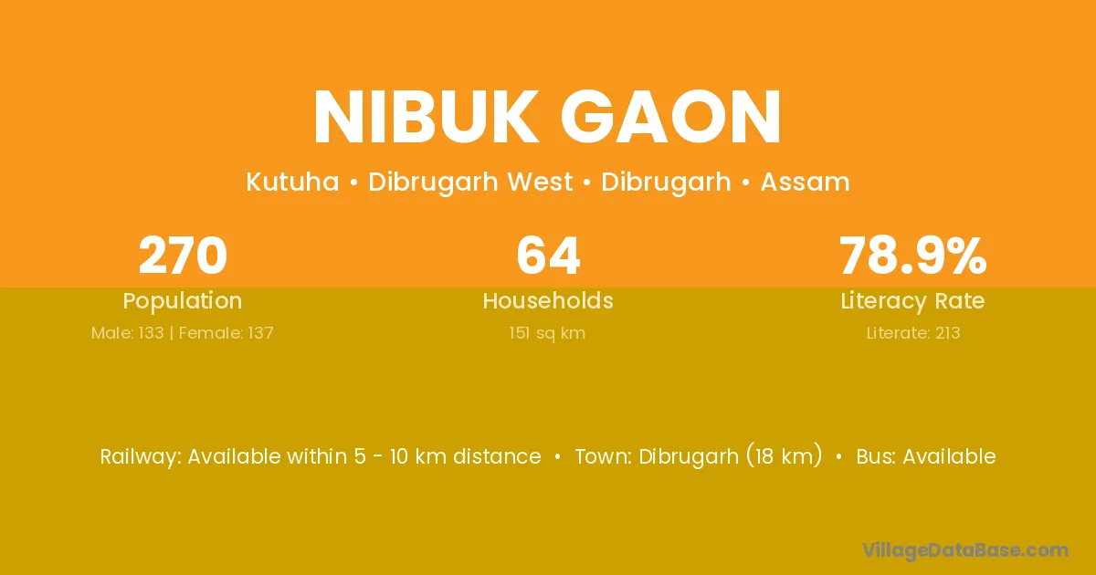 Dibrugarh (18 km) is the nearest town to Nibuk Gaon village for major economic activities and is located approximately 18 km away.