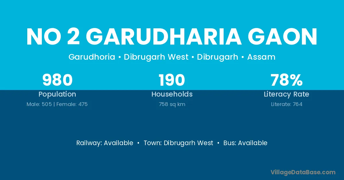 No 2 Garudharia Gaon village has a total population of 980 people, of which 505 are males and 475 are females.
