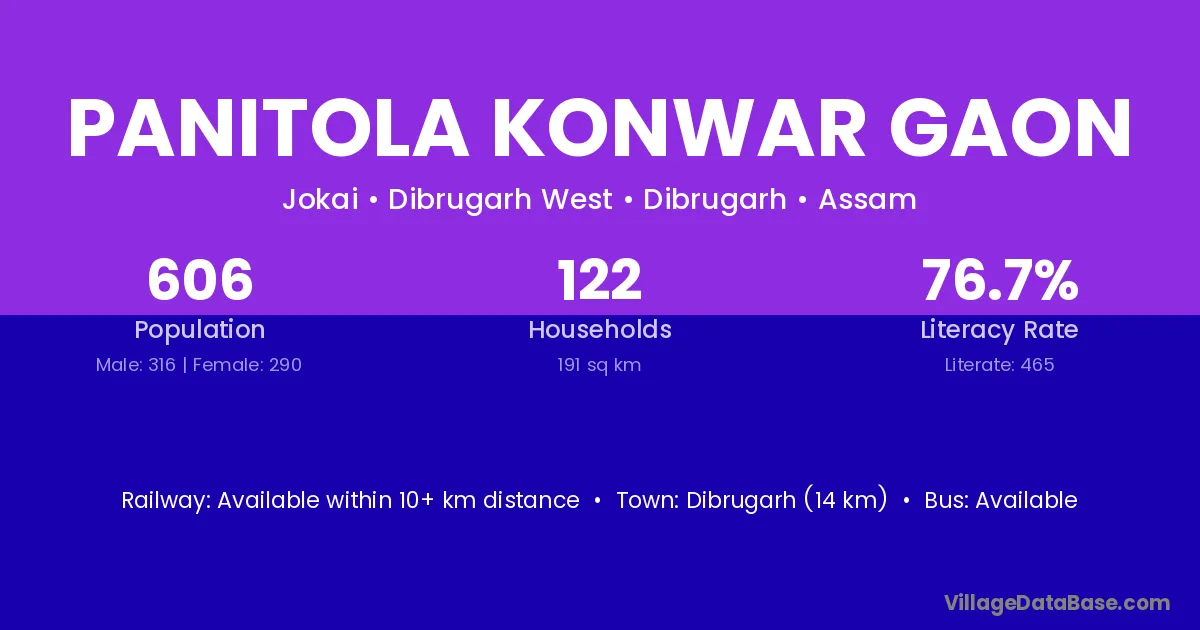 Dibrugarh (14 km) is the nearest town to Panitola Konwar Gaon village for major economic activities and is located approximately 14 km away.