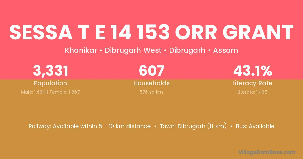 Dibrugarh (8 km) is the nearest town to Sessa T E 14 153 Orr Grant village for major economic activities and is located approximately 8 km away.