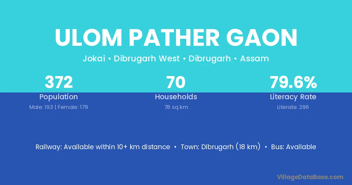 Dibrugarh (18 km) is the nearest town to Ulom Pather Gaon village for major economic activities and is located approximately 18 km away.