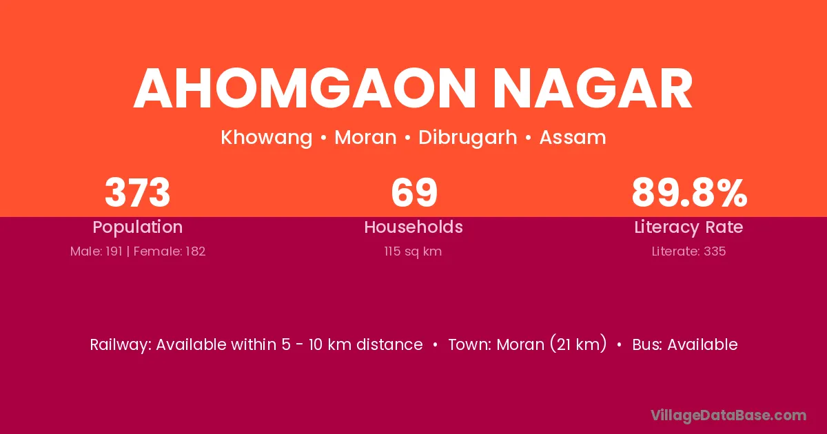 Moran (21 km) is the nearest town to Ahomgaon Nagar village for major economic activities and is located approximately 21 km away.