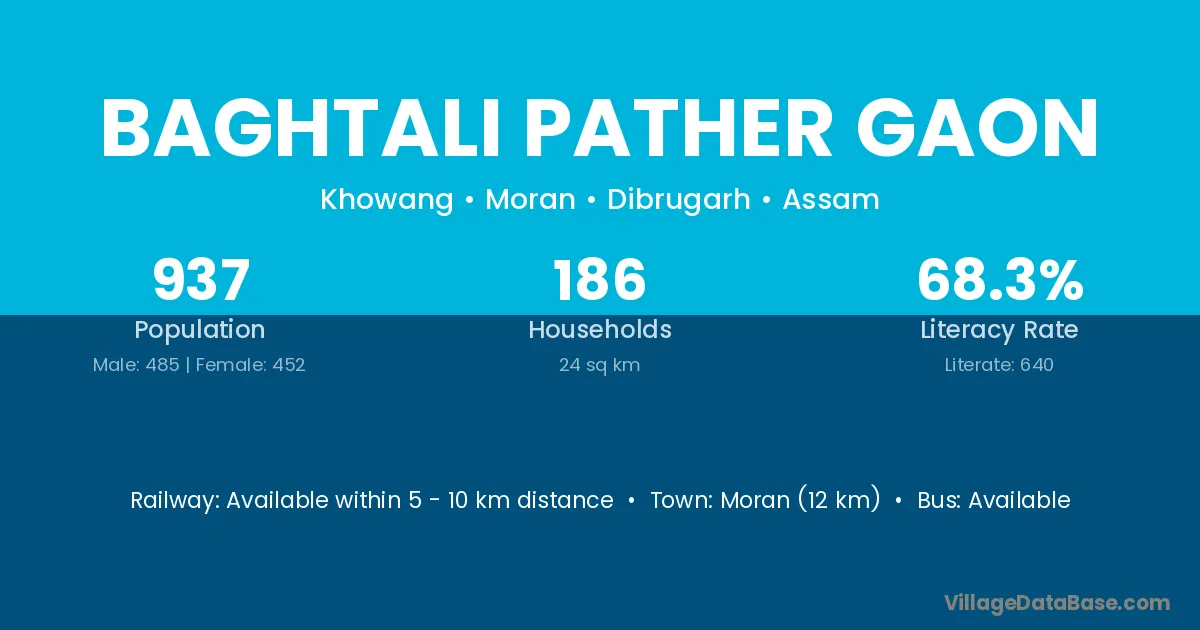 Moran (12 km) is the nearest town to Baghtali Pather Gaon village for major economic activities and is located approximately 12 km away.