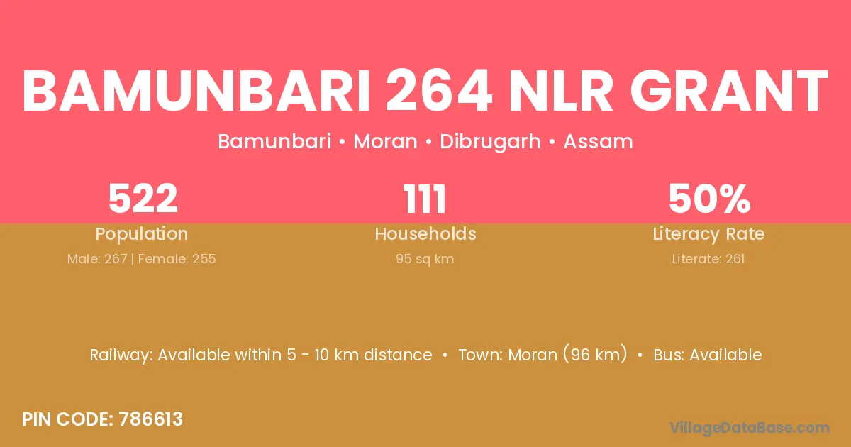 Bamunbari 264 Nlr Grant village has a total population of 522 people, of which 267 are males and 255 are females.