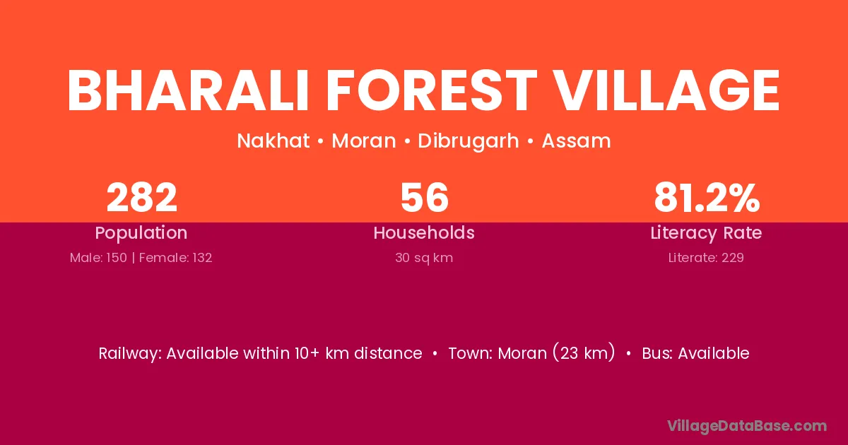 Moran (23 km) is the nearest town to Bharali Forest Village village for major economic activities and is located approximately 23 km away.