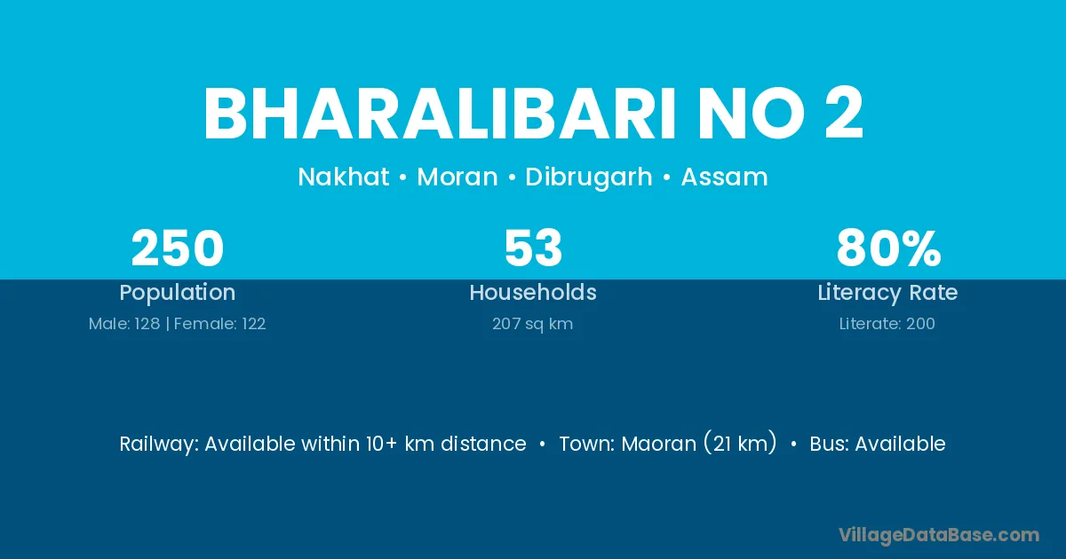 Bharalibari No 2 village has a total population of 250 people, of which 128 are males and 122 are females.