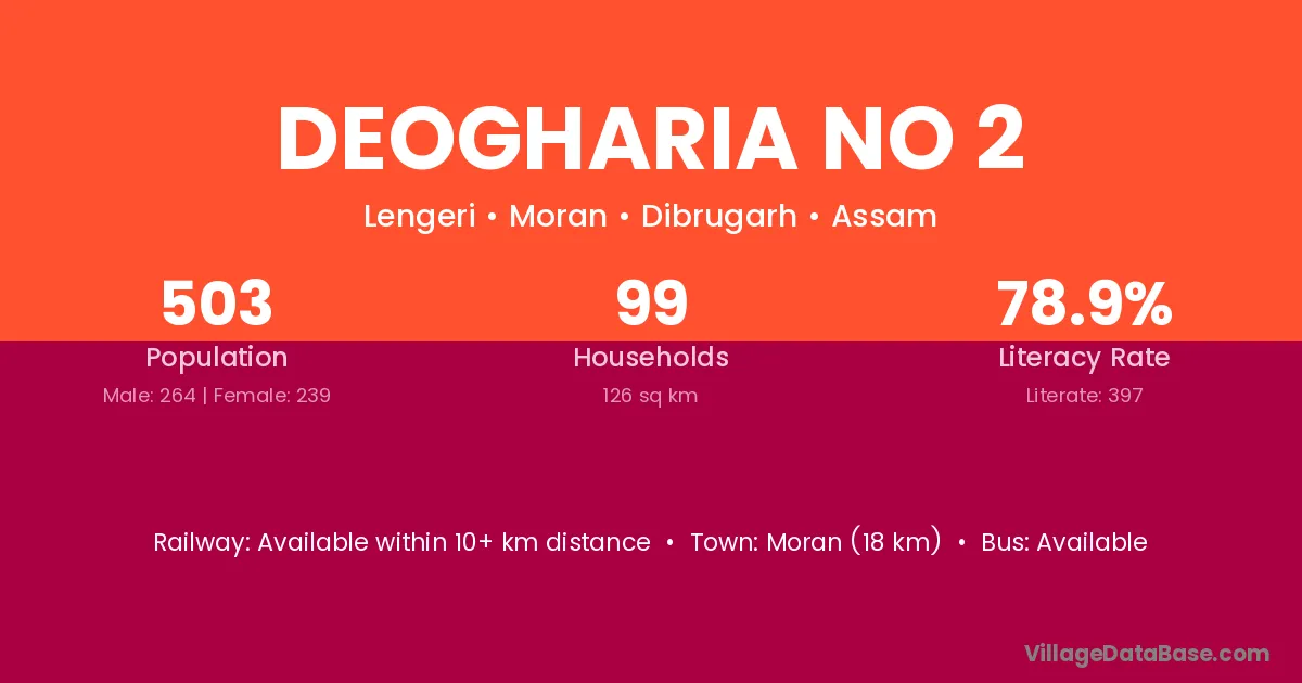 Deogharia No 2 village has a total population of 503 people, of which 264 are males and 239 are females.