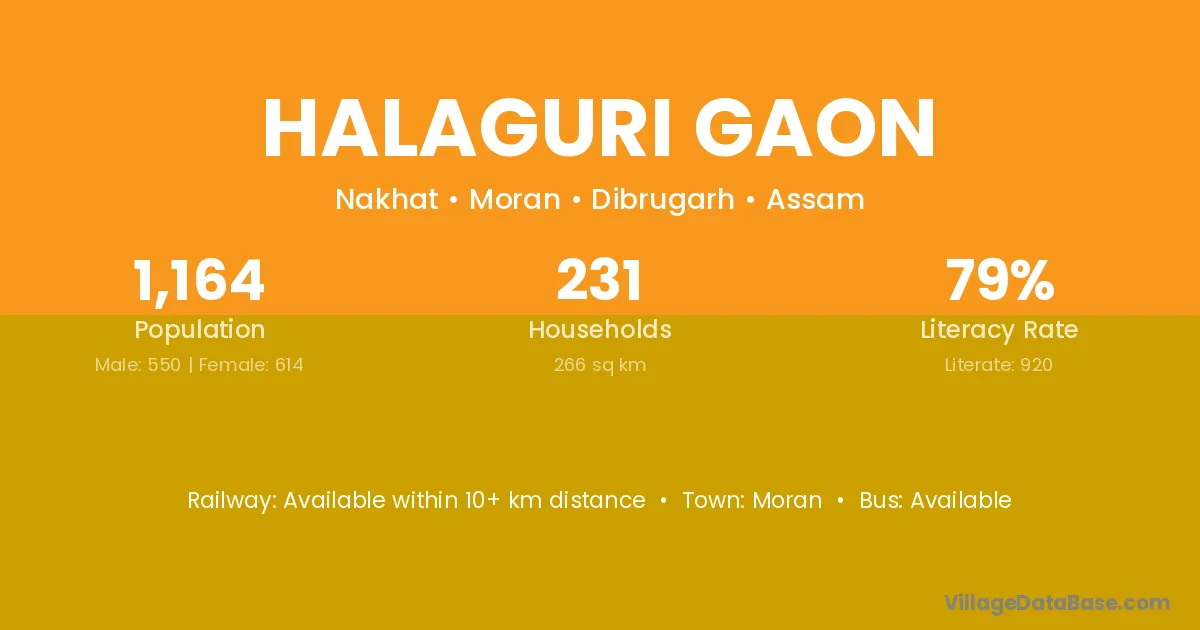 Halaguri Gaon village has a total population of 1,164 people, of which 550 are males and 614 are females.
