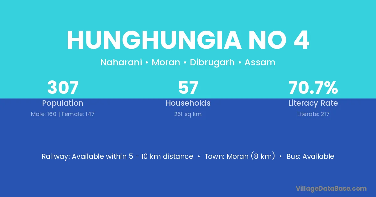 Moran (8 km) is the nearest town to Hunghungia No 4 village for major economic activities and is located approximately 8 km away.